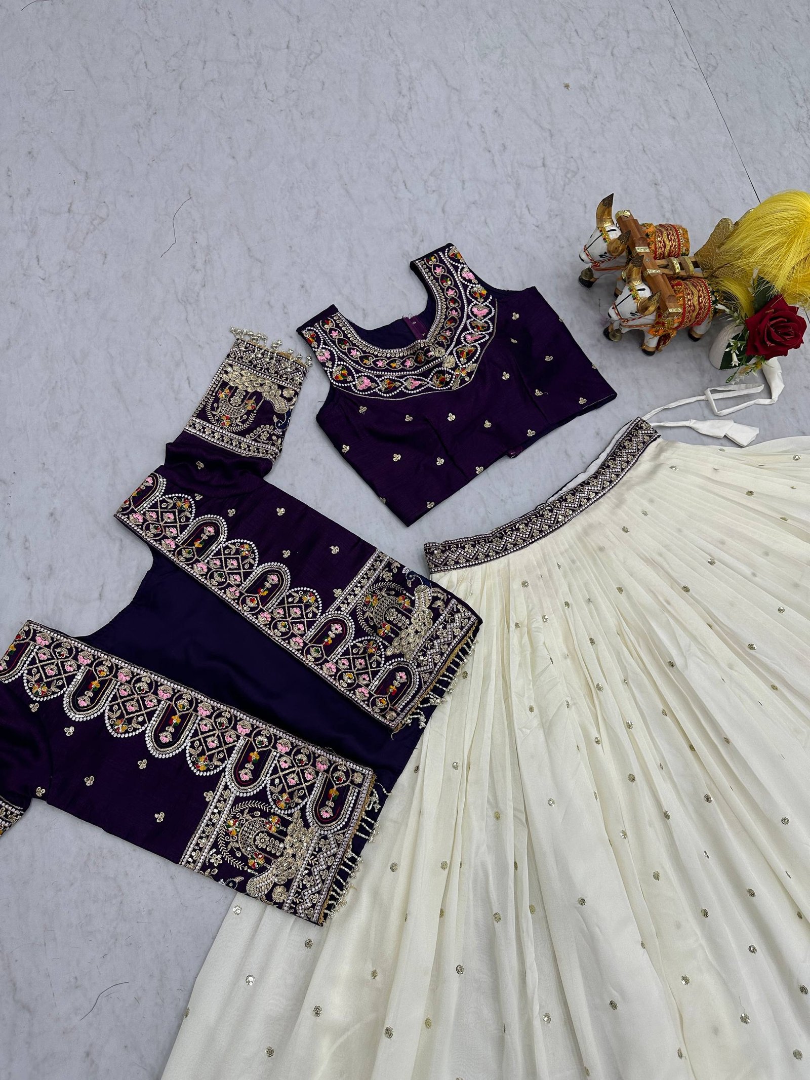 Step into the spotlight with our VYRA Luxe Signature Edition. This 3-piece ensemble features a meticulously embroidered Choli, a voluminous Lehenga, and a sophisticated Koti (Shrug), all crafted from Pure Vichitra Silk. Designed for the modern woman who cherishes tradition with a touch of contemporary flair.